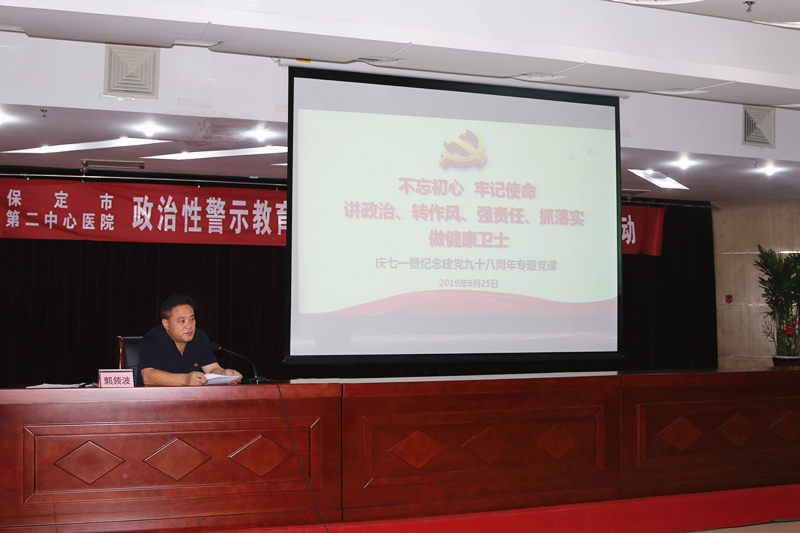 按照会议安排,郭领波书记结合“讲政治、转作风、强责任、抓落实”行动和此次专项治理活动开展了“不忘初心、牢记使命”主题党课教育。通过回顾党的历史,生动讲述了具有教育意义的历史人物故事,强调共产党员要守好初心,担好使命,政治上,做忠诚向党的表率;责任上,做勇于担当的表率;自律上,做清正廉洁的表率。同时,告诫医务工作者要践行习近平总书记提出的“敬佑生命、救死扶伤、甘于奉献、大爱无疆”的新时代卫生健康职业精神,指出这就是新时代医务工作者的初心和使命。公立医院是我国医疗服务体系的主体,是党领导的卫生健康战线的主要力量,回归公益性是大势所趋,民心所向,与我们每个人息息相关,号召全体医务人员要守初心,记使命,做政治清醒的卫生健康人,将此次专项治理活动与“讲转强抓”行动统筹衔接,一体推进,坚决整治行业不正之风,维护好卫生健康行业良好形象,以高尚的医德、优良的技术打造医院特色服务品牌,全面建成保北区域医疗中心,为人民健康保驾护航,以优异的成绩向建国70周年献礼,以坚定地步伐向百年目标奋进。